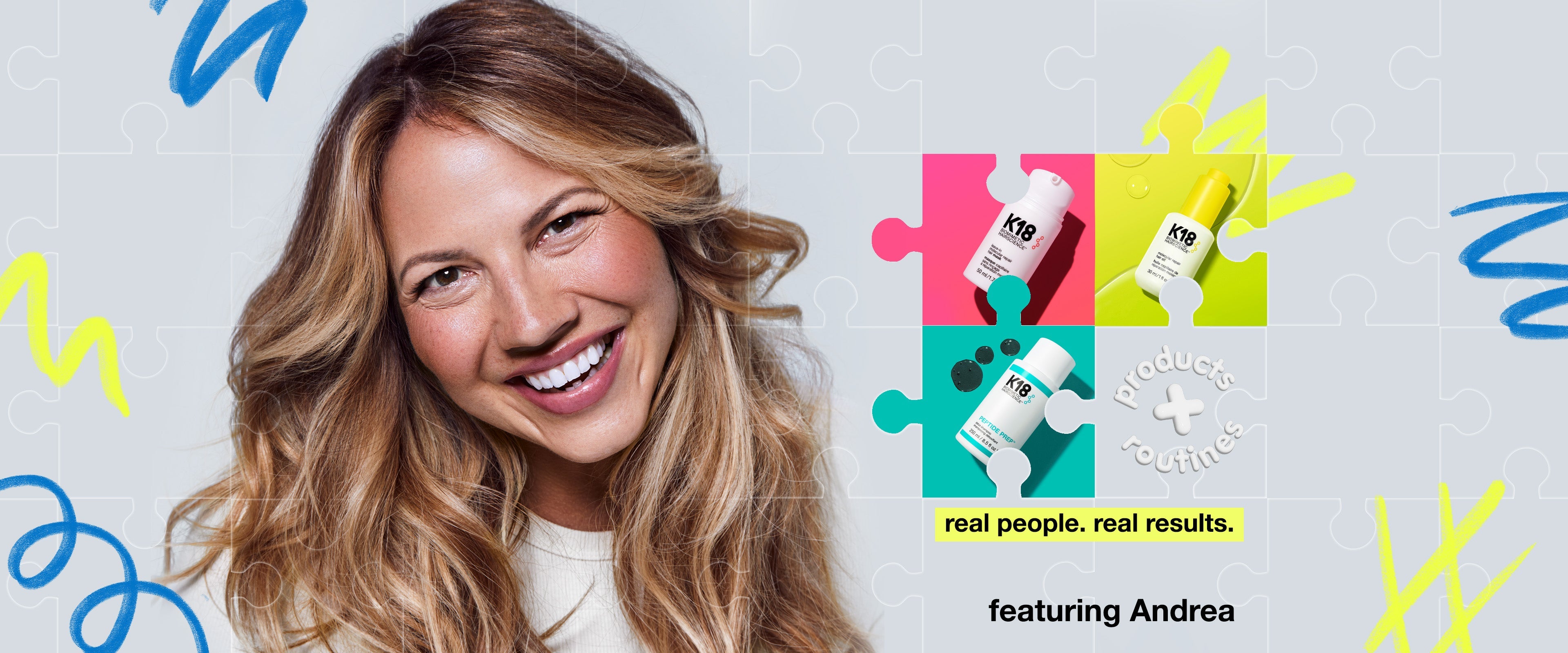 In the salon, Andrea’s stylist makes her hair goals a reality thanks to K18REPAIR™. This damage repair duo restores hair strength + elasticity before and after bleaching and extensions installation. At home, she uses the detox shampoo to wash weekly without stripping her color. To maintain her hair strength through extensions, she uses the K18 leave-in molecular repair mask to reverse damage in 4 minutes. Then, Andrea preps for heat styling and adds shine with the molecular repair hair oil.