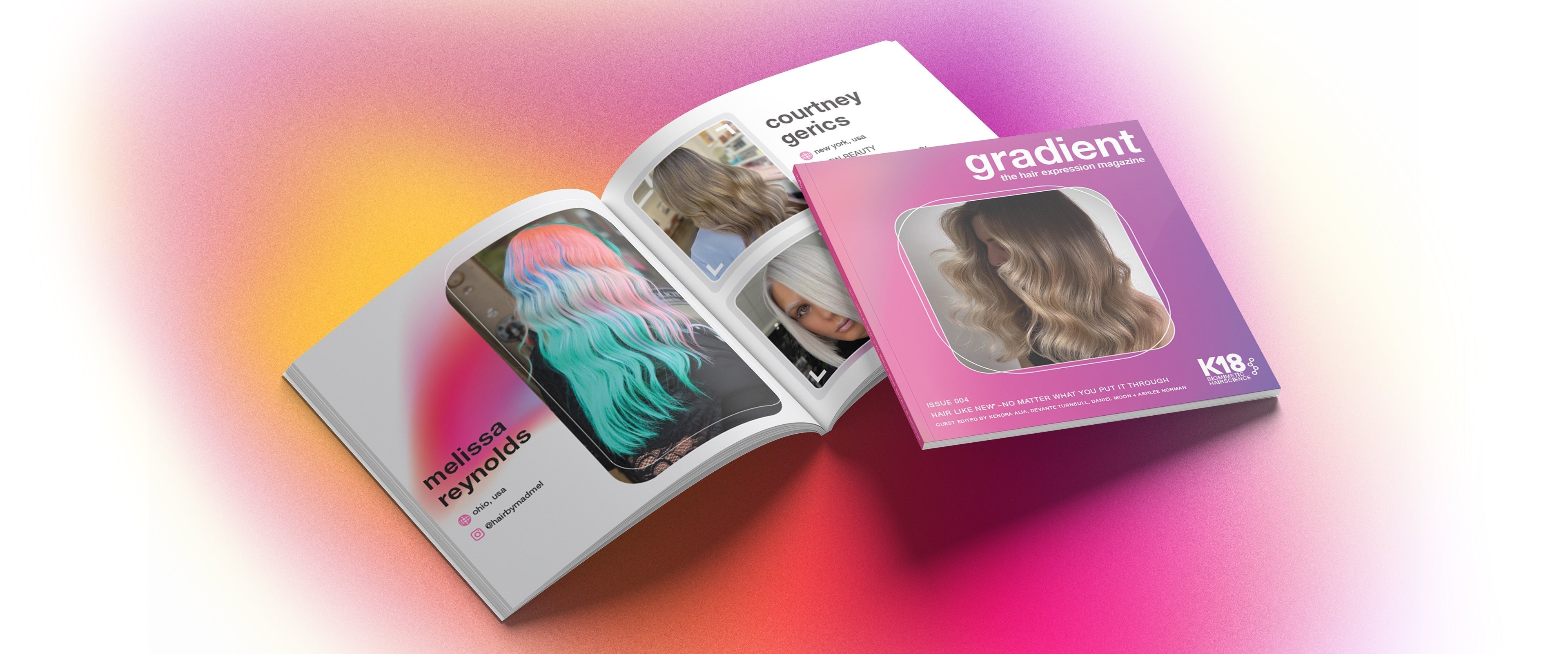 gradient: the hair expression magazine is our chance to showcase your hair artistry made possible by K18PEPTIDE™. This K18-patented peptide uniquely clicks into hair’s keratin structure to repair damage from lightener, color + chemical services, and heat* for every client, color, style, texture, and service.