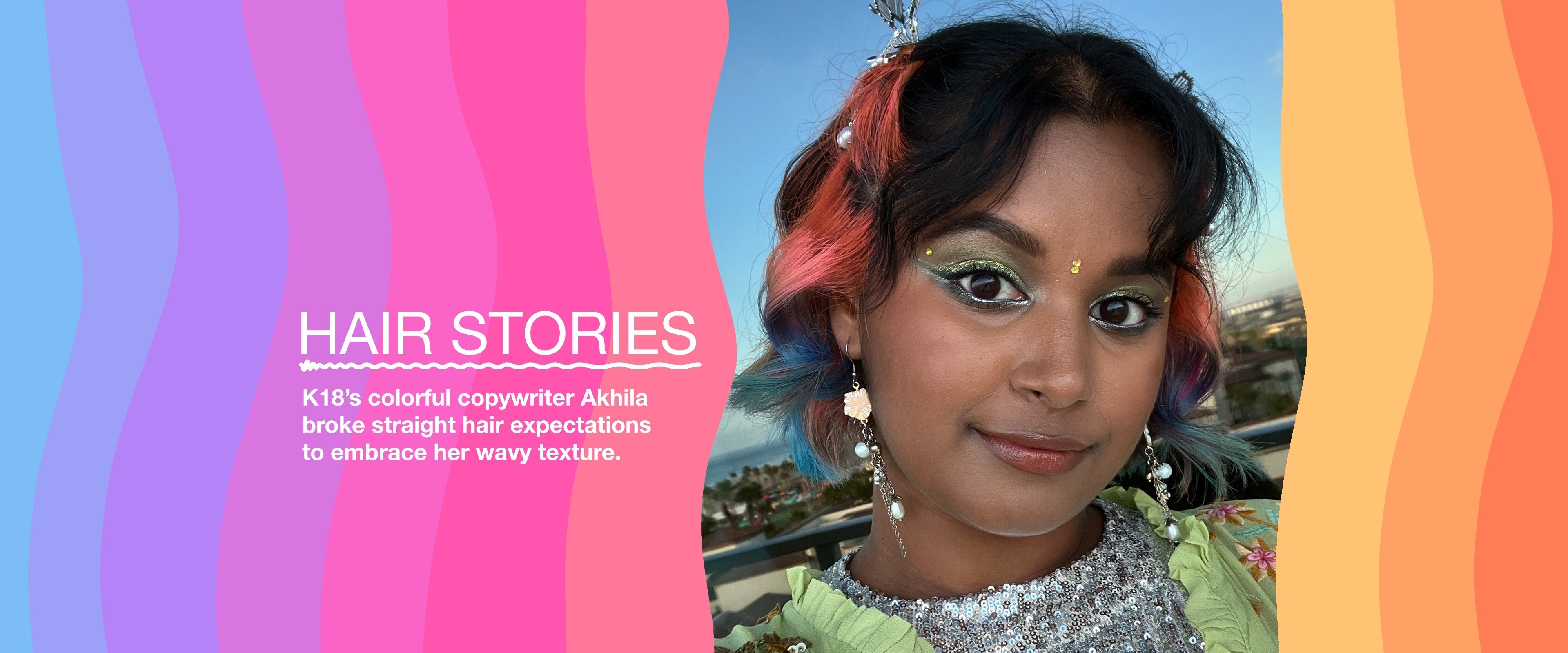 Meet Akhila, K18 copywriter, and colorful hair lover. She loves changing up her wavy hair expression with confidence, but that wasn’t always the case.